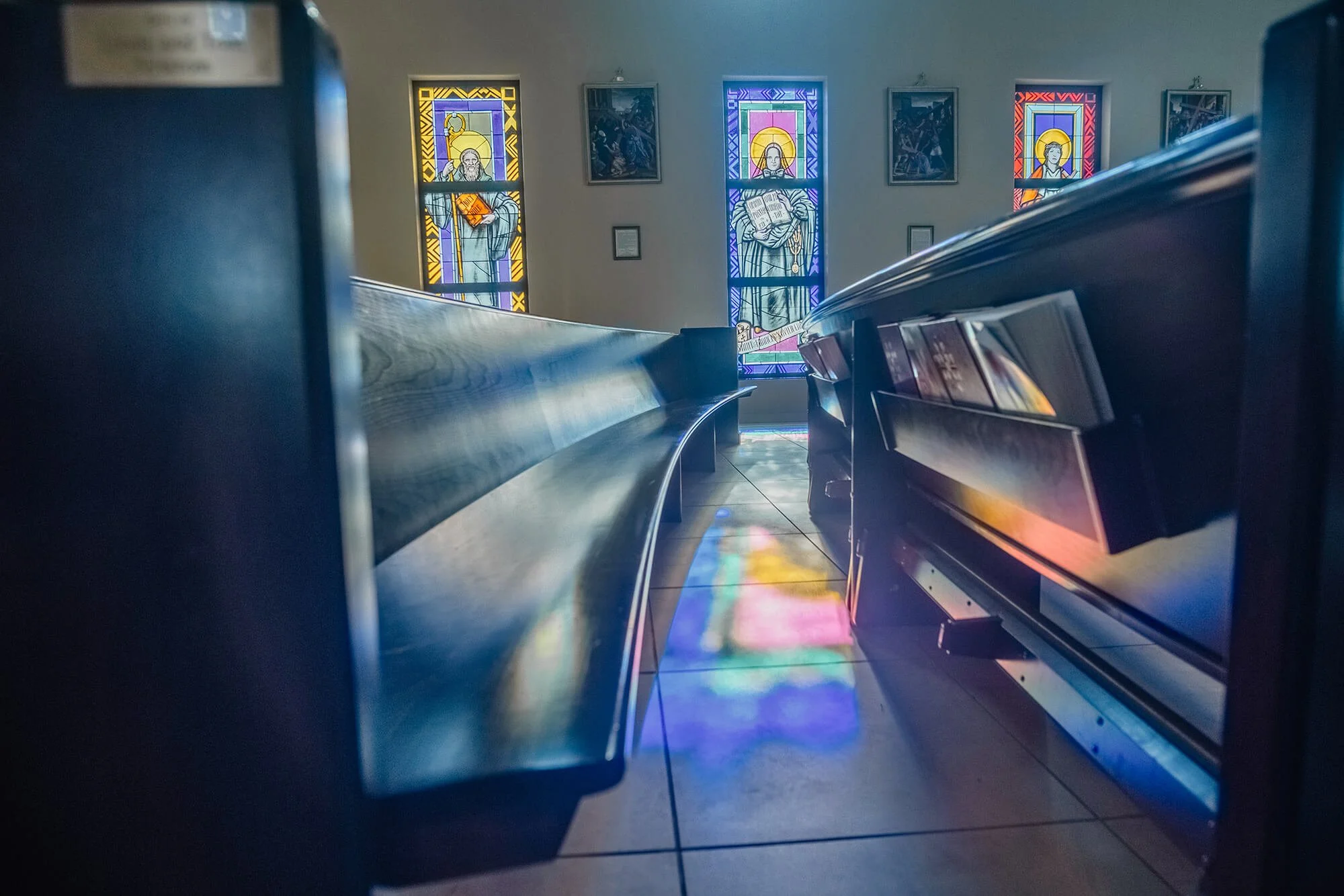 The stained glass window shown at the Trappist Monastery in Huntsville, Utah.